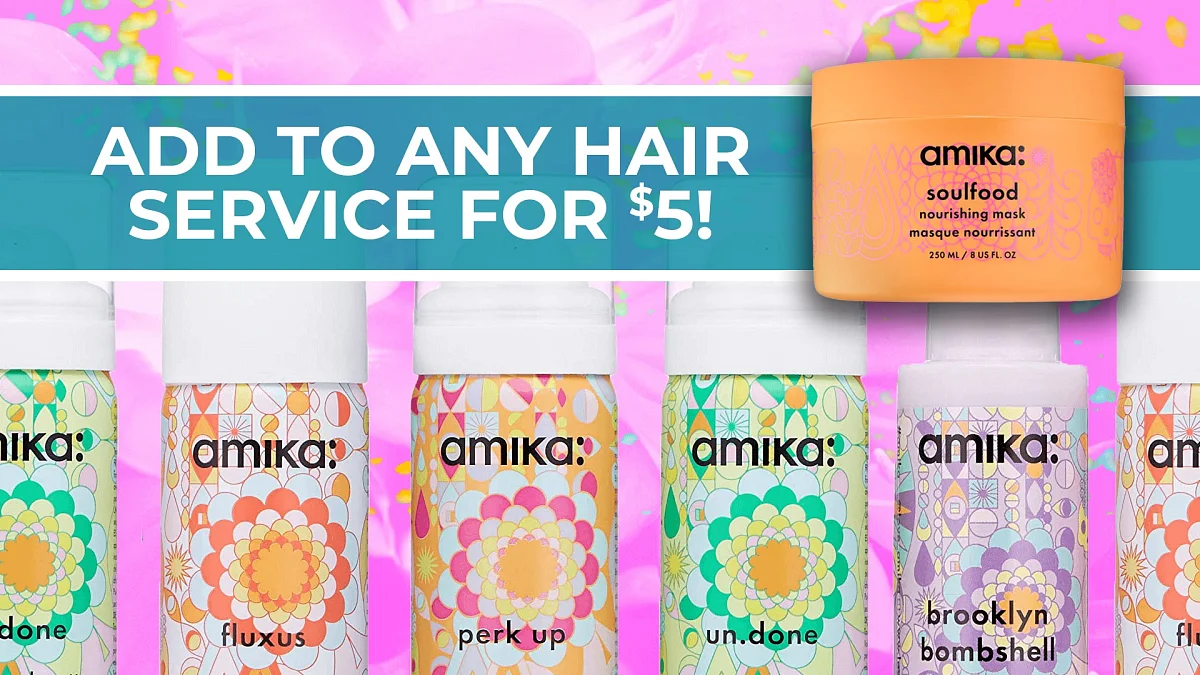 Add Amika soulfood nourishing mask to any hair service for $5! An ultra-luxurious + rich mask is packed with vitamins + nutrients to condition the hair making it soft, silky, and smoother than ever. Perfect for all hair types!